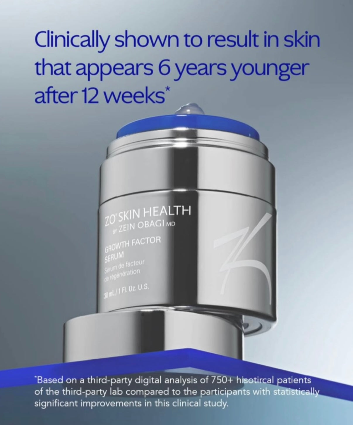 GROWTH FACTOR SERUM: SE 6 ÅR YNGRE UT PÅ 12 VECKOR!! ZO Skin Health gjorde en stor studie, med 750 deltagare, där de mätte flera olika parametrar. Det otroliga resultatet, av att använda Growth Factor Serum, var att man ser 6 år yngre ut, efter 12 veckors användning.