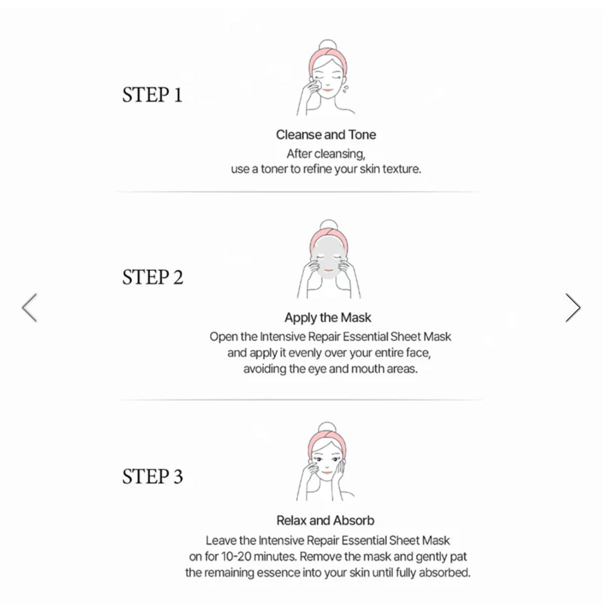 Efter rengöring, applicera toner för att förbereda huden. Öppna förpackningen, veckla ut masken och applicera den så att den följer ansiktets konturer. Låt verka i cirka 10–20 minuter och ta sedan bort masken. Klappa försiktigt in kvarvarande essens i huden tills den absorberats.