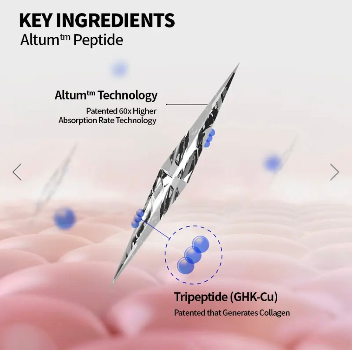 - Altum Peptide™: Spikelnålar bundna med peptider för att stimulera kollagenproduktion, fibroblastaktivitet och förbättra hudens elasticitet.
